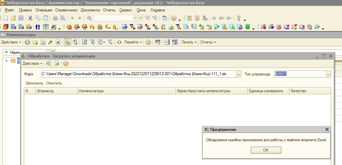 Эта обработка уже переносит штрихкоды из подготовленной таблицы непосредственно в 1С. Здесь сейчас выдает ошибку (скрин ниже)