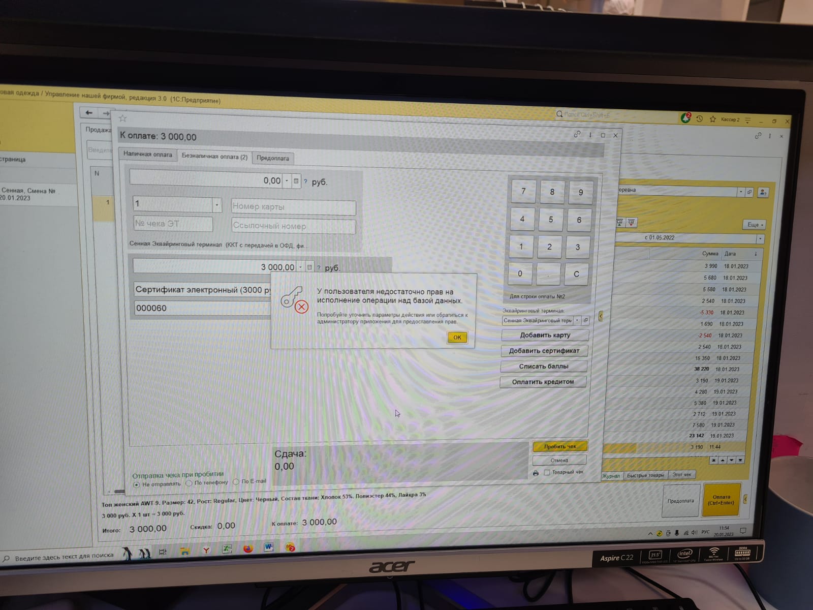 УНФ 3.0.2.178 доработать роль кассира для оплаты подарочным сертификатом. Сейчас при попытке зачесть оплату сертификатом возникает ошибка скрин прикрепил.