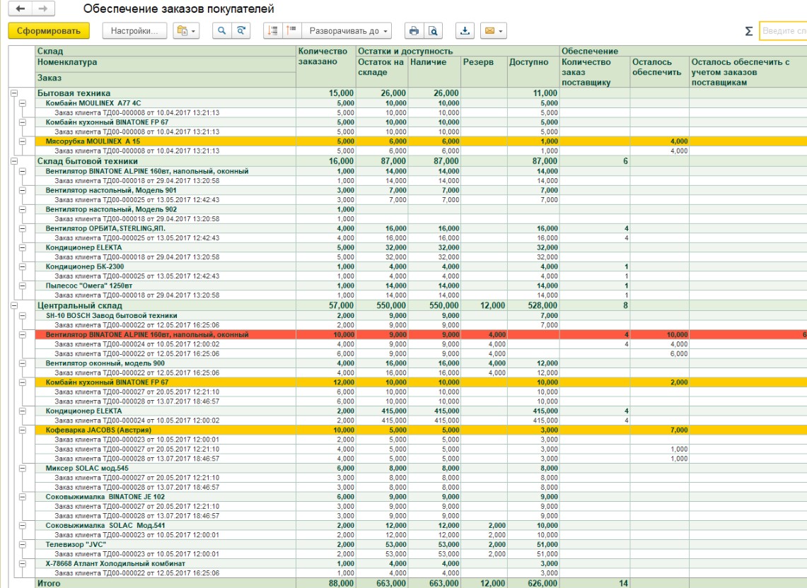 Выбрав необходимые заказы покупателей свести их в одну общую таблицу. Пример таблицы приложил к заданию. Необходимо добавить так же колонку "к заказу" которая должна быть размещена после колонки "осталось обеспечить с учетом заказов поставщику". Если есть потребность, то количество из колонки "осталось обеспечить с учетом заказов поставщику" в колонку "к заказу" должно проставляться автоматически и если требуется, количество должно иметь возможность редактирования по усмотрению пользователя. После колонки "к заказу" необходимо сделать колонку "поставщик" для выбора поставщика для позиции, но поставщик должен быть проставлен изначально по умолчанию по последнему документу поступления позиции товара. После чего формируются заказы поставщикам без проведения документов. Для последующей проверки.