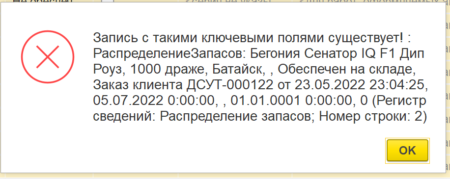 После обновления УТ 11.4 до УТ 11.5 (так как 11.4 снята с поддежки) у большинства заказов поменялся статус отгрузки сам по себе. А если хочешь изменить заказ или поставить не обеспечивать то пишет ошибку - "Запись с такими ключевыми полями существует .... Регистр сведений распределение запасов номер "строки". В прикреплённом файле скриншоты самой ошибки.