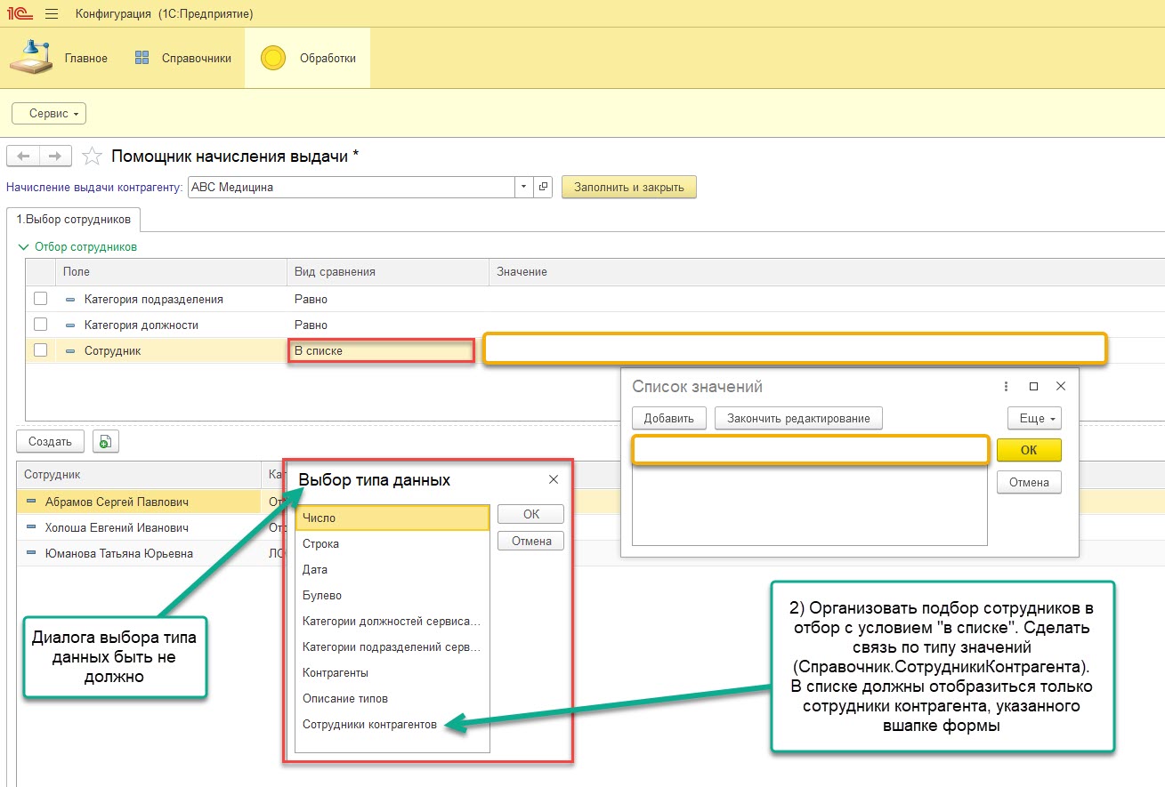 2. Не работает отбор с условием "в списке". Платформа требует выбрать тип данных.