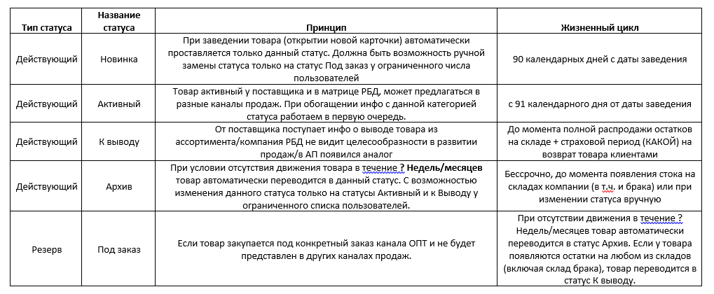 Внедрить в 1С следующий перечень статусов товаров
