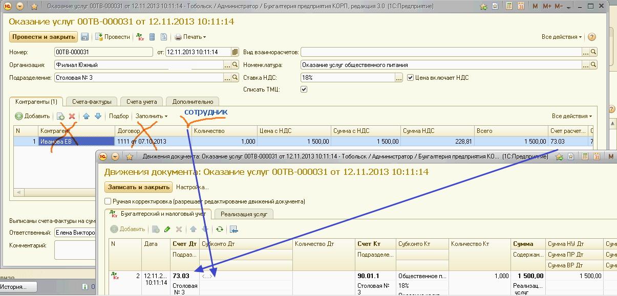 Ссуть: питание сотрудников фирмы проводят документом Оказание услуг с выбором счета расчетов 73 (штатная возможность),