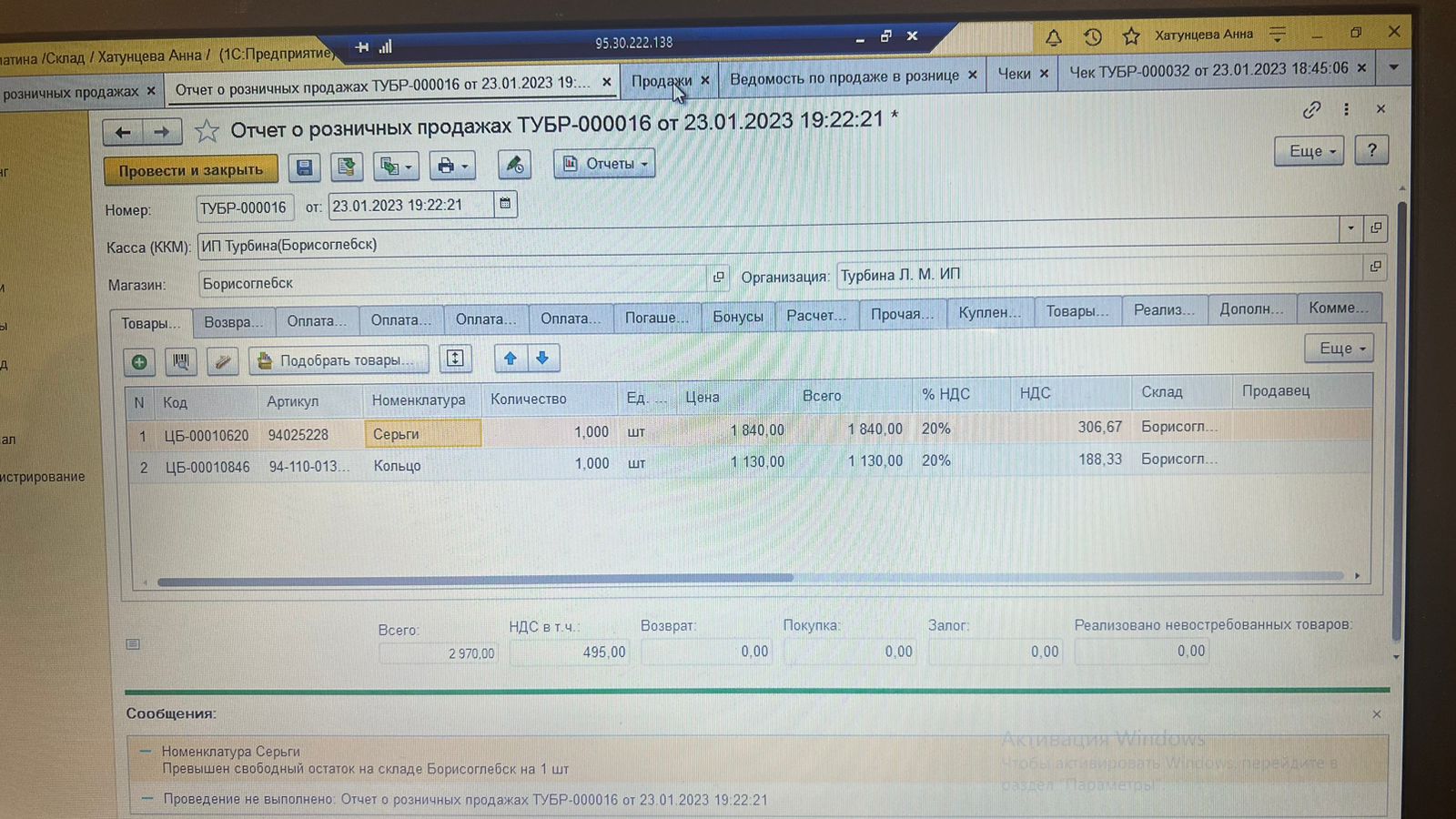 При проведении отчета о розничных продажах, в случае недостачи изделия на складе, возникает ошибка “Номенклатура Цепь … превышен свободный остаток на складе“. Данное сообщение не дает понимание, какого именно изделия не хватает.