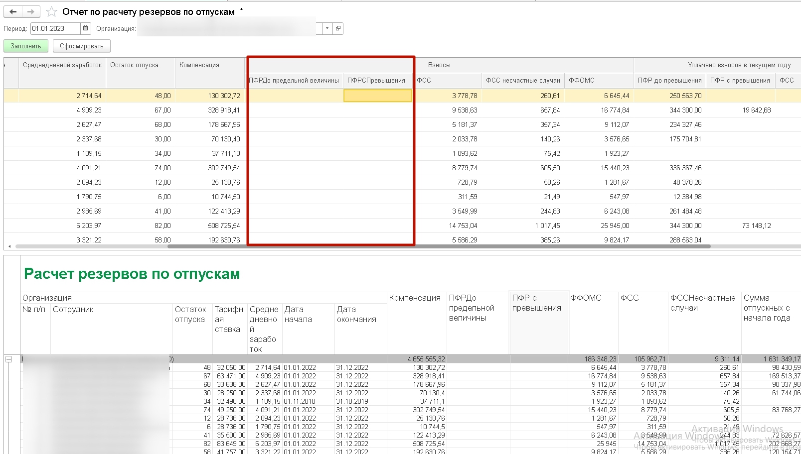 Далее обработка считает какие взносы бы начислились на эту сумму, если бы мы на дату отчета захотели ее выплатить,