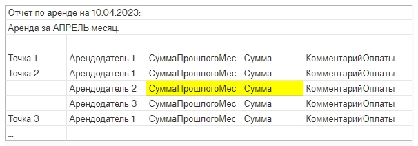 СуммаПрошлогоМес - сумма из справочника Арендодатели в прошлом месяце (в примере - в МАРТЕ). Если она отличается от Суммы этого месяца, то подкрашиваем обе ячейки желтым.