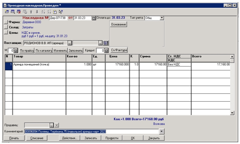 Товар = Справочник.Номенклатура 000003138 Аренда помещений (точка)