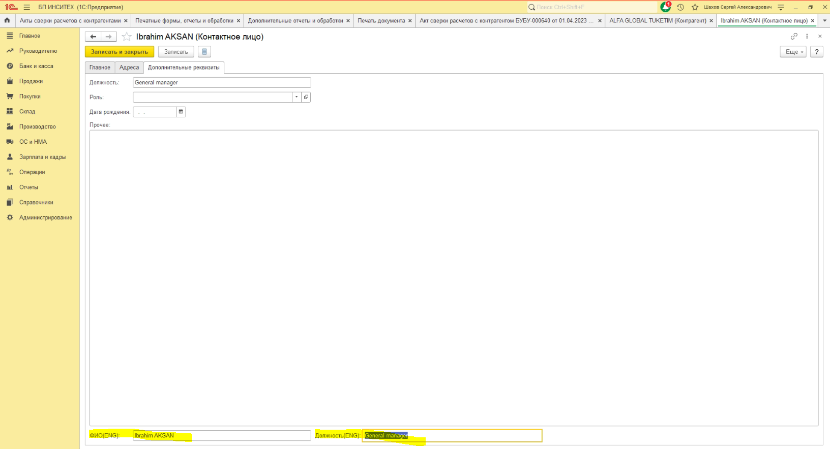Убрать ошибку не заполнен представитель контрагента, в доп. реквизитах сделать поля ФИО(ENG)...
