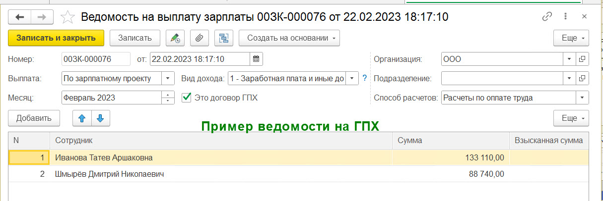 Разработать выплату зарплаты сотрудникам ГПХ по ведомости в 1С:Бухгалтерии для "УСН...