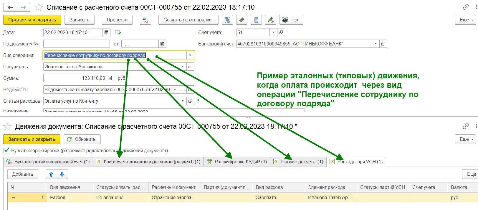 Необходимо доработать программу, чтобы можно было одной платежкой делать выплаты списку сотрудников по ведомости с видом операции "Перечисление заработной платы по ведомостям". Технически программа дает создать и провести такой документ, но она не делает необходимых движений в регистрах расходов УСН.