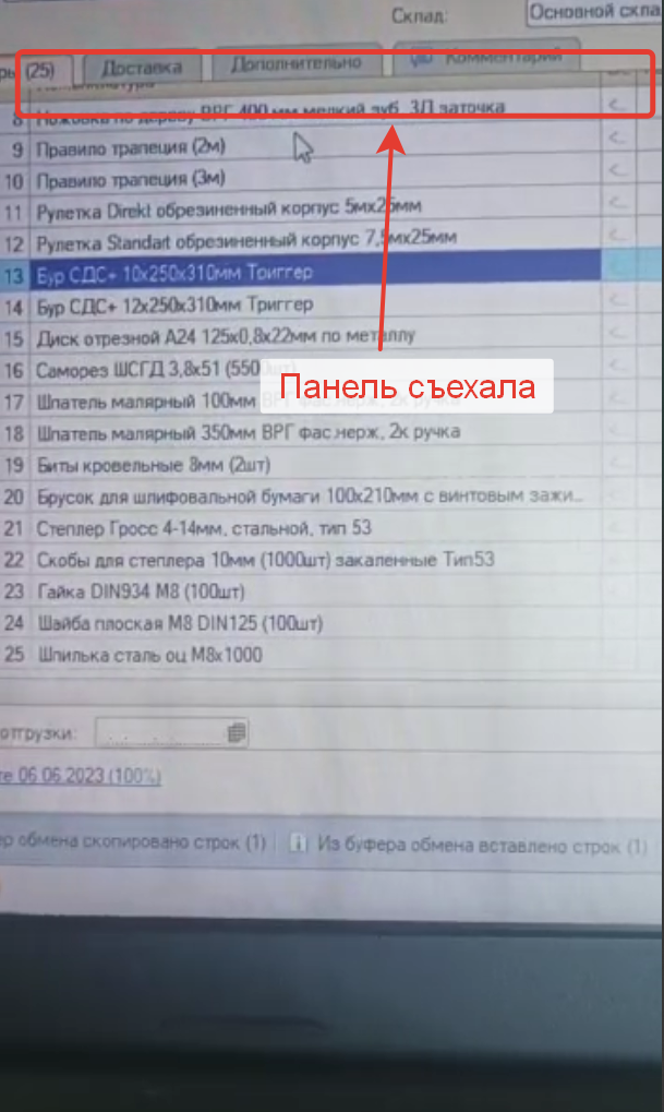 После обновления платформы, в документах, в табличных частях товарах, где есть кнопки (скопировать, добавить и т.п.), пропадает панель, когда взаимодействуешь с "бегунком". Фото примера пропажи панели прикрепляю.