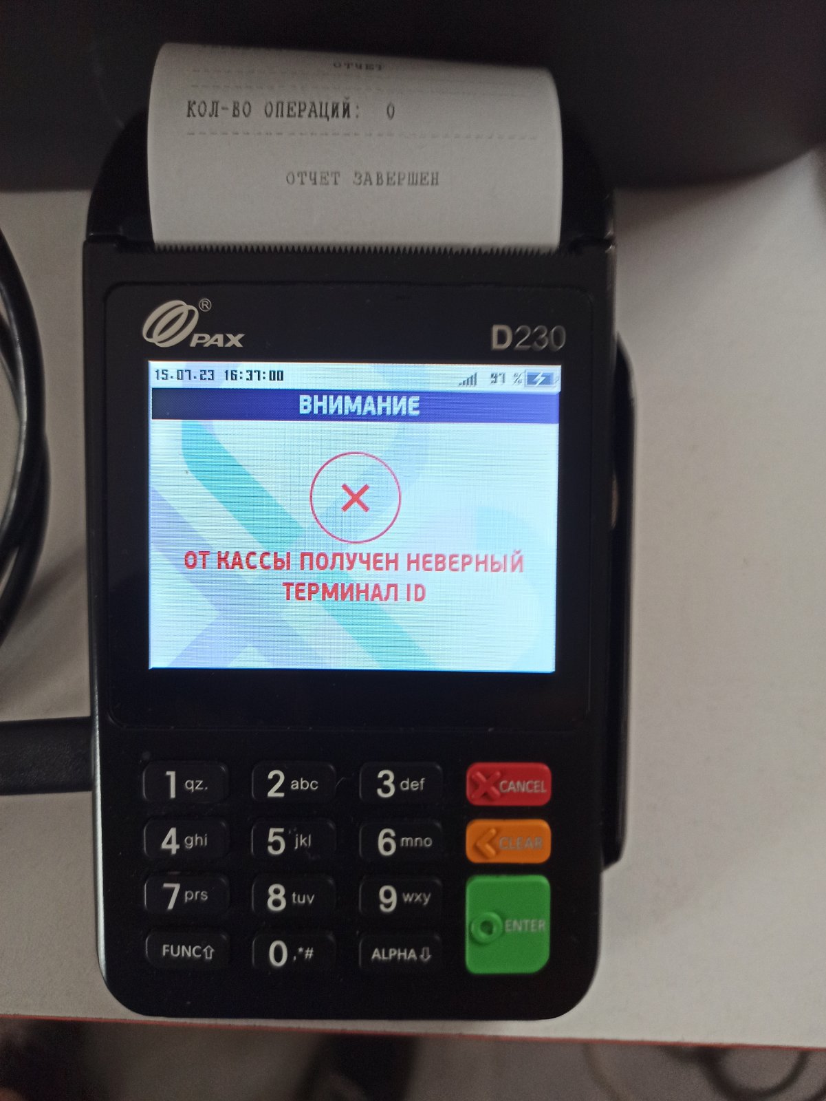 Конфигурация 1С Розница 2.3 РИБ на три магазина. На одном из магазинов не могу подключить терминал от Тинькофф Pax D230 Драйвера все установлены, тесты от драйвера INPAS пройдены успешно. Когда пытаюсь пройти тест в 1С на терминале кратковременно выскакивает сообщение "От кассы получен неверный терминал ID" в самой Рознице всплывает сообщение "Тест не пройден. Статус=0 (Неопределенный статус). Обратились в техподдержку банка. Они отключили проверкуID после чего тест в Рознице стал проходить успешно, но при безналичной оплате 1С наглухо висла. Попросили техподдержку обратно вернуть проверку терминала ID.
