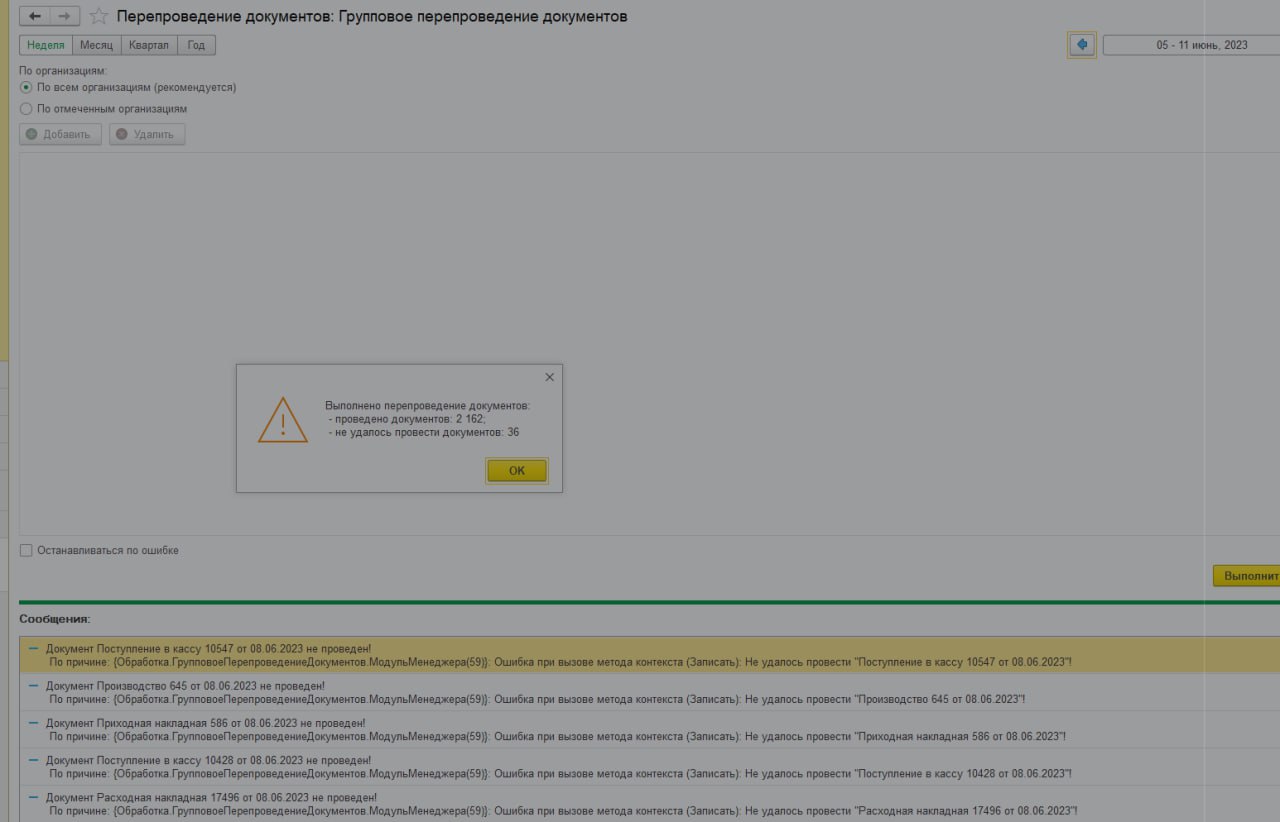 Найти ошибку, почему не все документы перепроводятся групповой обработкой в 1С УНФ 1.6.