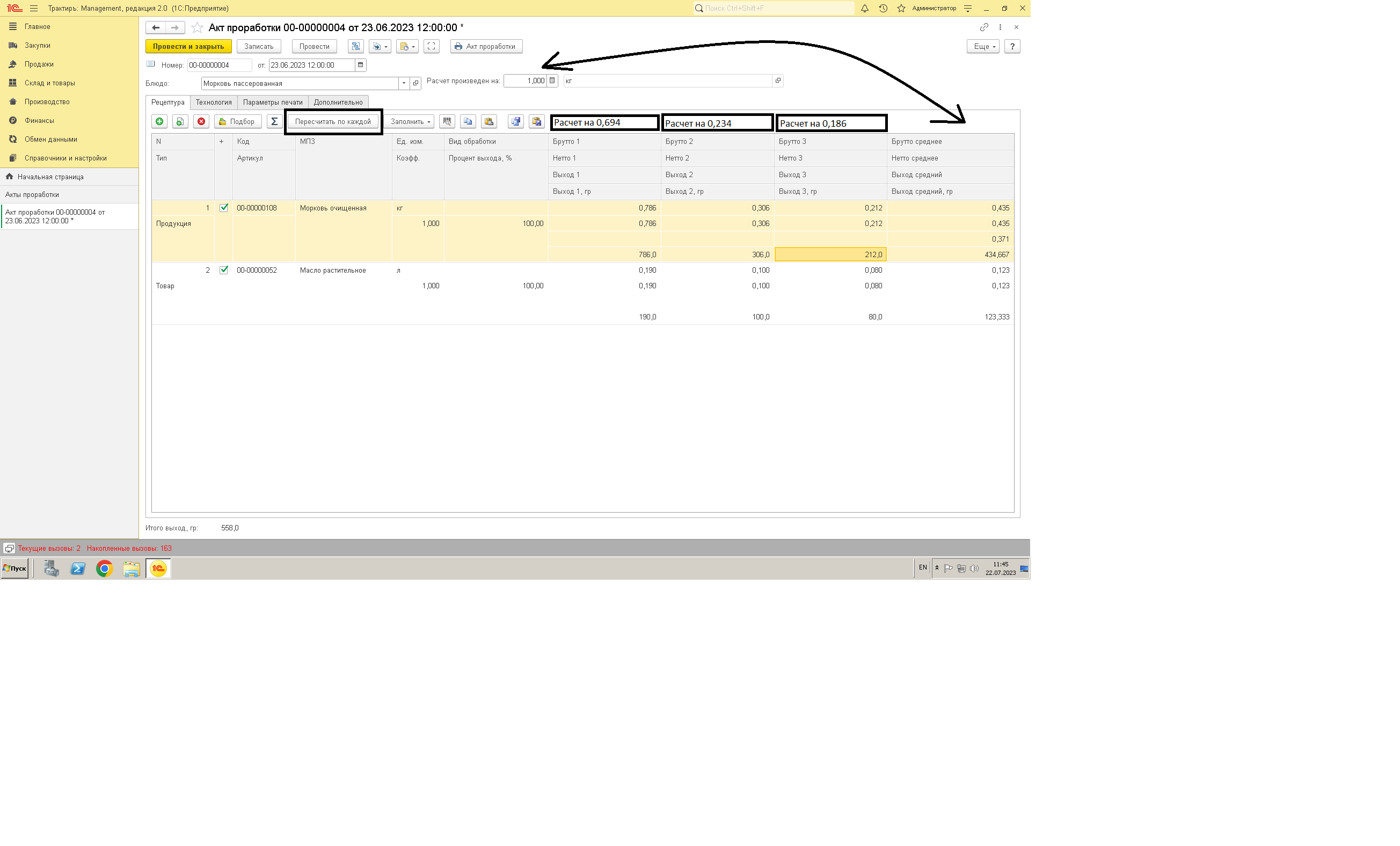 Сейчас акт проработки можно создать, только на одну единицу, то-есть на 1кг или на 0.500 грамм и получить среднее значение по выходу.