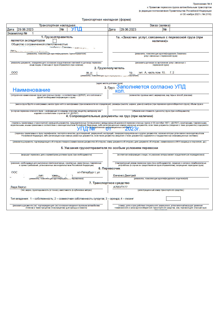 Нужно доработать обработку формирования ТН, чтобы отмеченные поля заполнялись автоматически. В файлах 1 и 2 отмечены нужные поля. В файле пример отдельно отмечено как должен выглядеть список товаров. Указывайте, пожалуйста, стоимость и сроки.