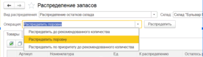 Нужно разработать операцию распределения запасов “Распределить поровну до рекомендованного остатка”. Новая операция распределения будет распределять товары поровну (логика операции “Распределить поровну”(рис 10)), но с учетом рекомендованного остатка(рис 11).