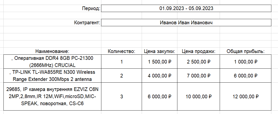 (Цена продажи из документа "Расходная накладная") - (Себестоимость товара из документа "Приходная накладная") * Количество = Прибыль.