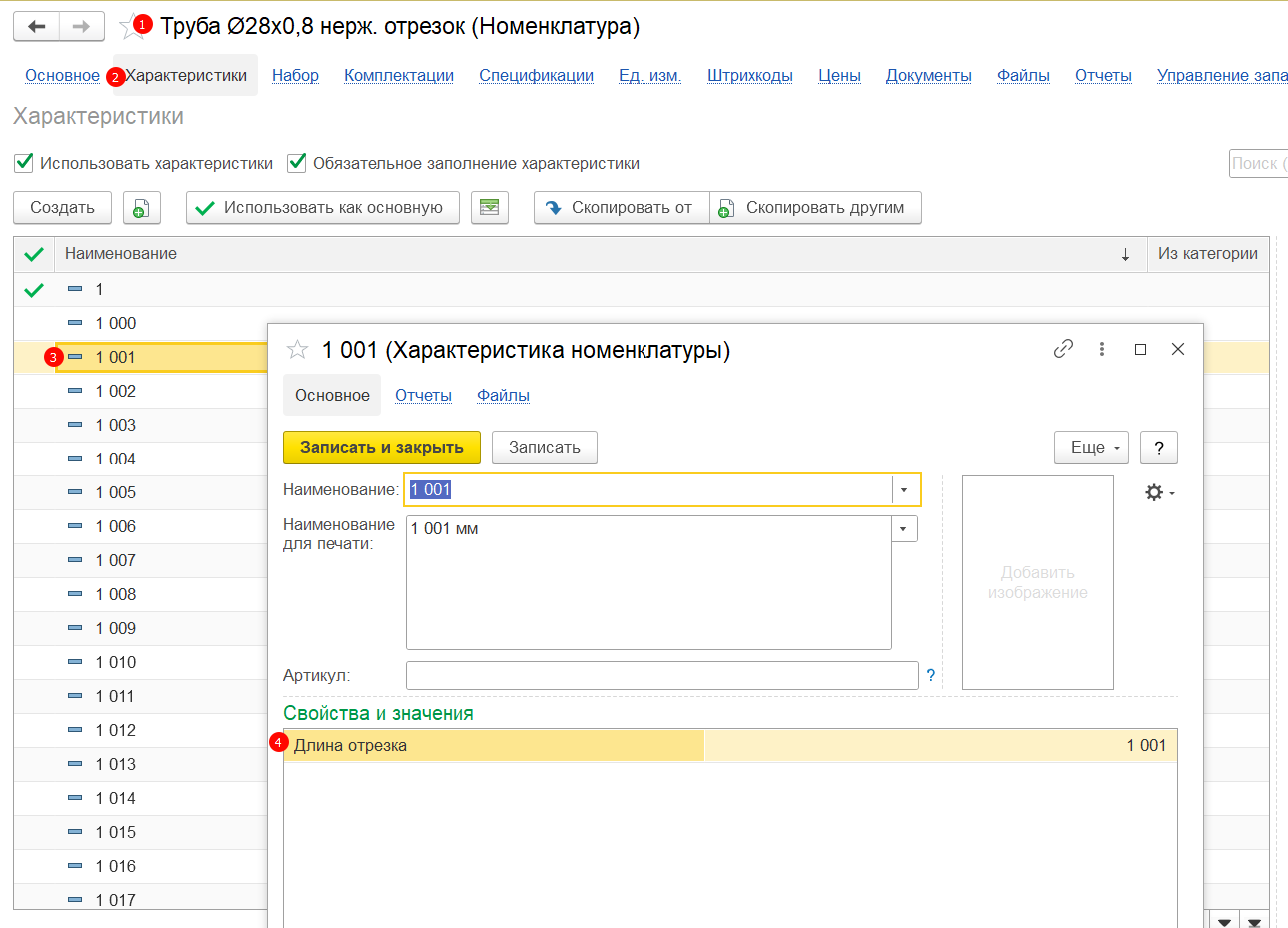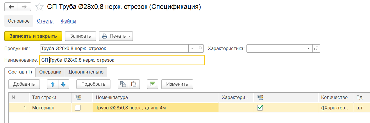 1. Есть Номенклатура, в характеристиках которых есть свойство, которое означает длину отрезка. Например, Номен = Труба, Характеристика.ДлинаОтрезка% = 450 мм. Итого: Труба (450 мм).
