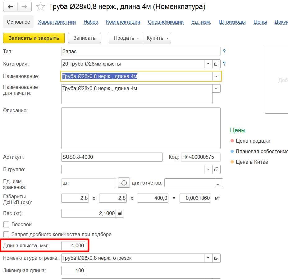 4. В номенклатуре заготовке есть доп.свойство длина хлыста
