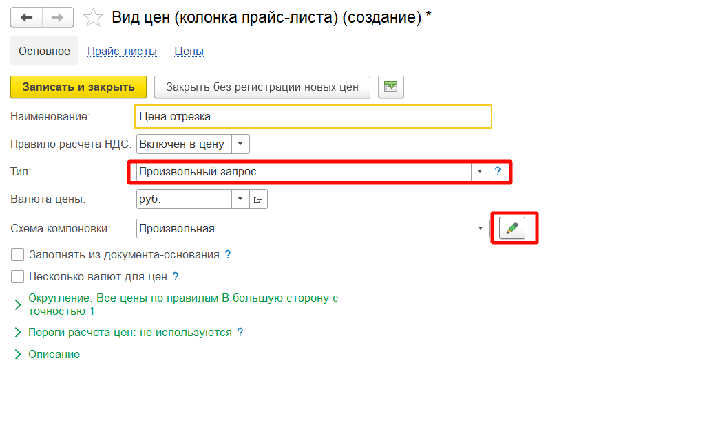 5. надо создать вид цены с типом ЗАпрос (СКД схему) который для всех характеристик цену как ЦенаХлыста(вид цены указываю как пользователь в передаваемых параметрах СКД)*ДлинаОтрезка/ДлинаХлыста.