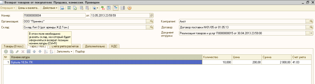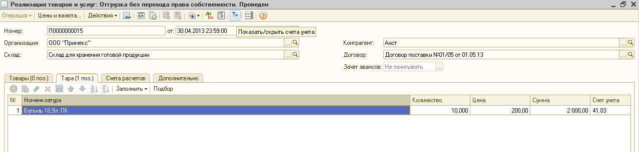 Нужен еще приход тары. Оборотная ведомость по 41.03 на дату реализации. По каким ценам вы учитываете тару? Пишите.