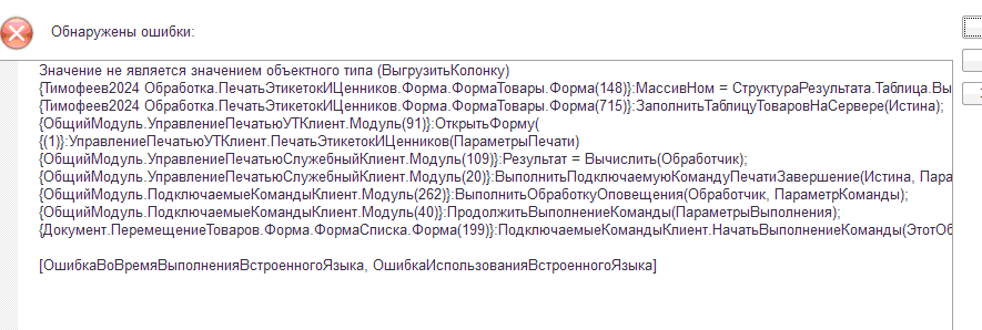 ошибку можно найти в обработчике - печать ценников и этикеток можно сразу проверить создав какую либо номенклатуру с ценой и ячейков