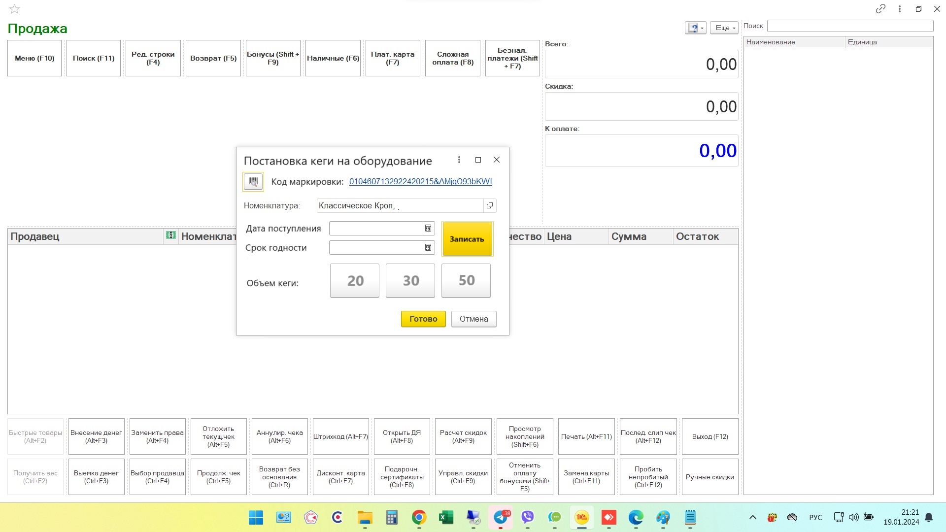 постановка кеги на кран, вывести РегистрСведений.КегиНаОборудованииРозливаИСМП в рмк, с дополнительными параметрами, с записью полного кода маркировки в Справочник.ШтрихкодыУпаковокТоваров.