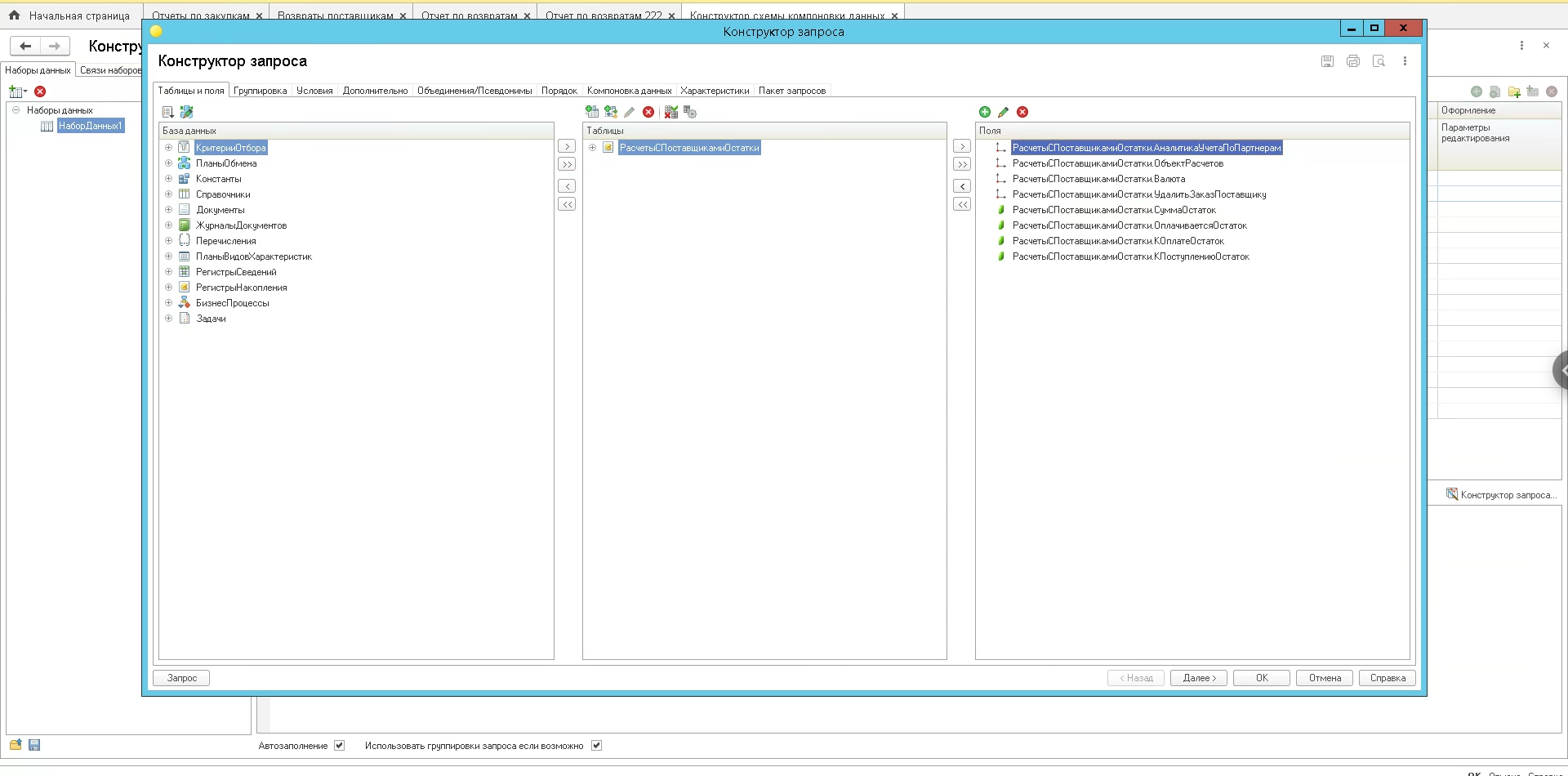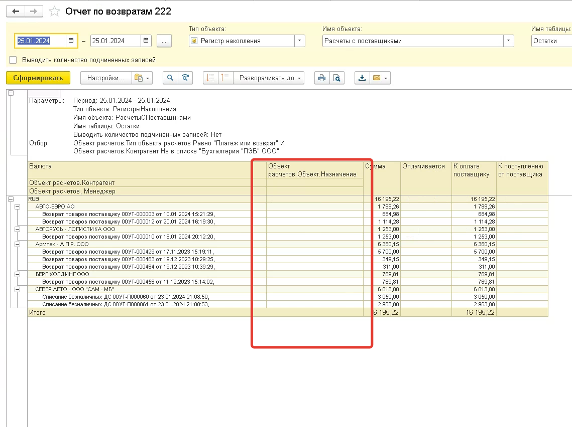 Нужно в универсальный отчет вывести параметр менеджер из заказа клиента в отчет по возвратам поставщику.