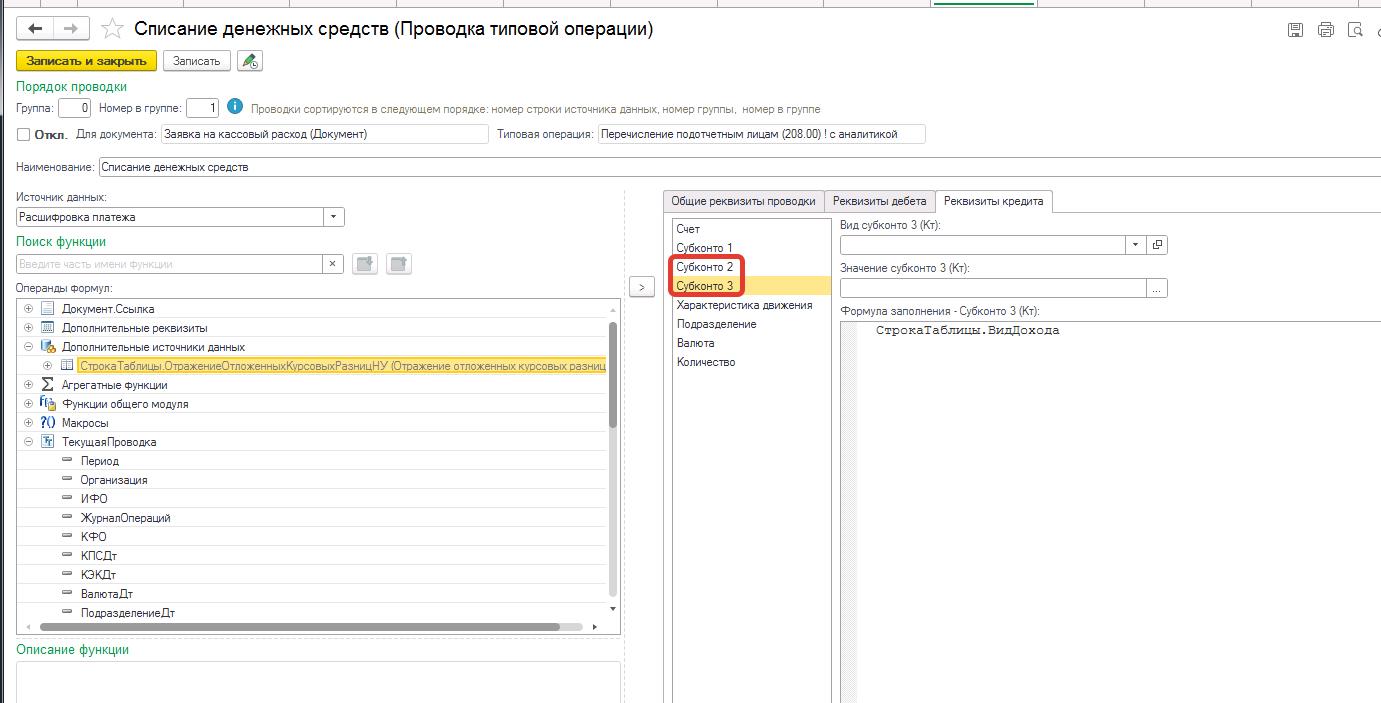 Нужно прописать в копии типовой операции БГУ 2.0 подстановку двух нетиповых субконто из табличной части "расшифровка"