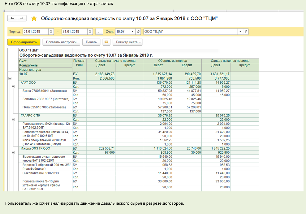 Пользователь хочет видеть ОСВ по счету 10.07 в разрезе договоров.