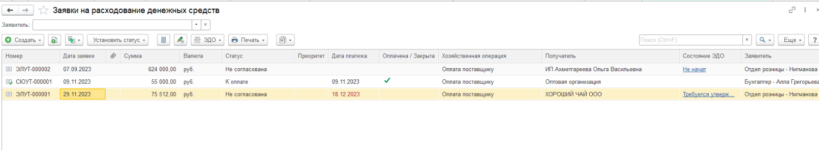 Цель задачи: настроить процесс создания заявок на расходование ДС и их согласования (изменение статуса) так, чтобы сотрудники, создающие заявку (заявители) в 1С создавали заявку на расход ДС и не могли менять статус, а их своим руководители (согласовывающее лицо), которые будут менять статус этих заявок, и на основании согласованных заявок уже будут создаваться расходные кассовые ордеры кассиром.