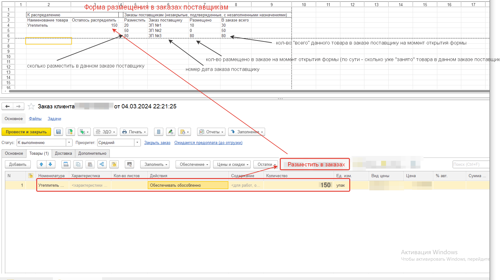К моменту проведения заказа клиента, в базе уже есть заказы поставщикам: требуется распределить назначения заказа клиентов по заказам поставщикам. Т.е. чтобы не в заказах поставщикам выбирать назначения, а указывать в заказе клиента - в какие заказы поставщикам и в каком количестве будет включена строка заказа клиента. вид формы, примерный, в файле.