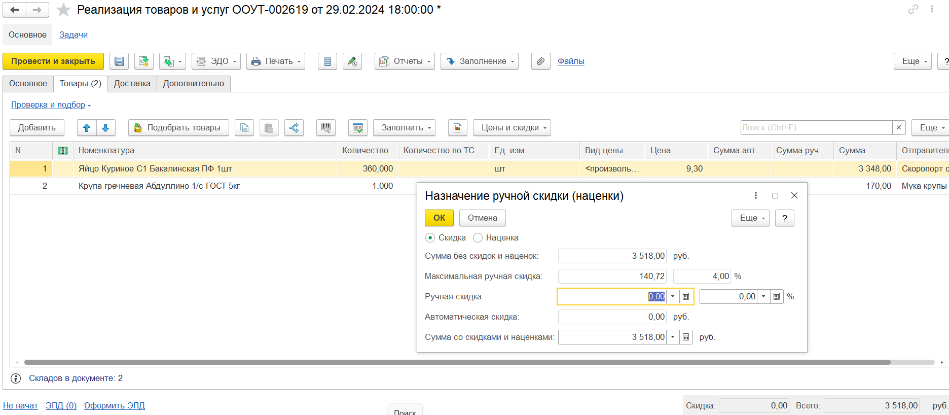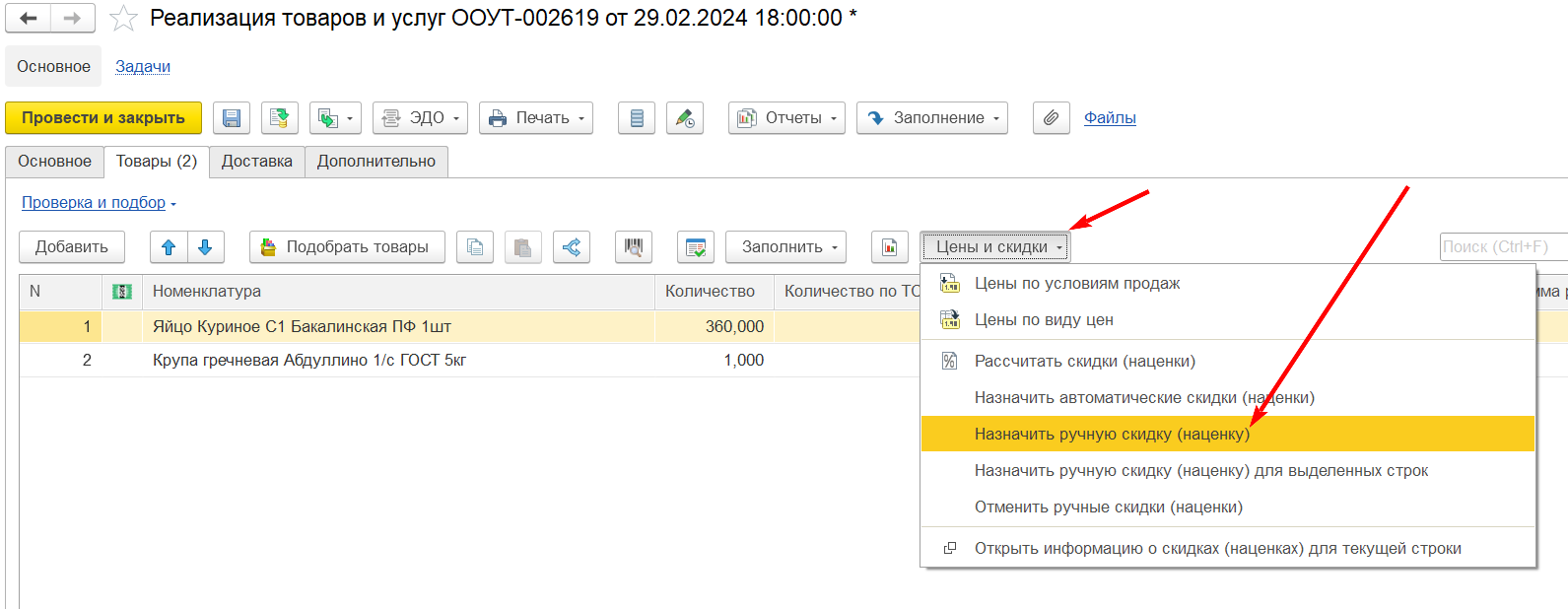 Надо полностью скопировать функционал с вышеупомянутой "Назначить ручную скидку", чтобы можно было и изменить цены на процент, и изменить цены так, чтобы сумма документа равнялась указанному значению (скрин тз2).