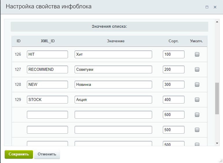 1. В конфигурацию добавлено несколько чек-боксов: ХИТ, НОВИНКА и др.
