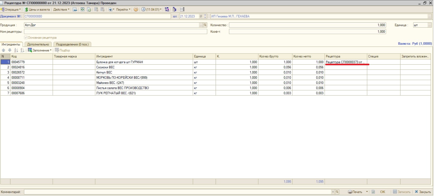 При печати этого документа печатаются номенклатуры из таблицы, а нужно чтобы печатались в том числе ингредиенты рецепта "булочка". В итоге печатный документ должен быть таким: