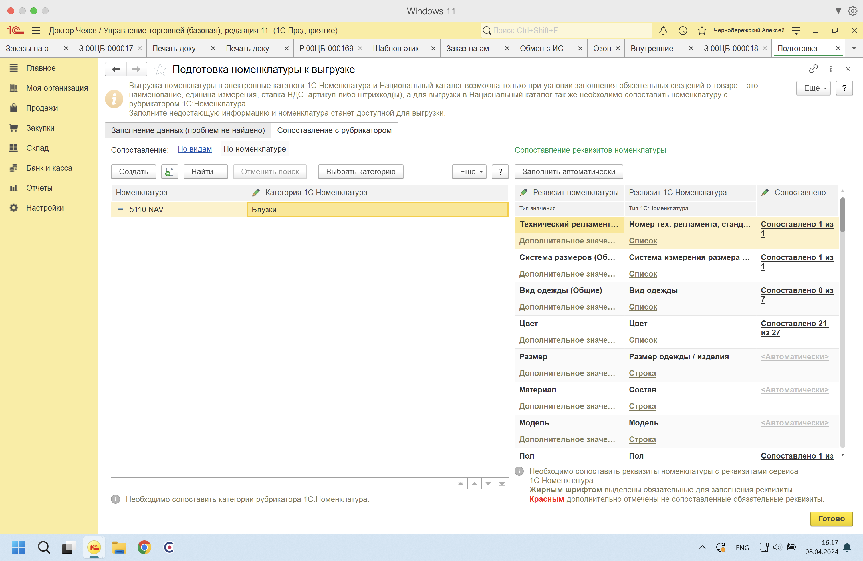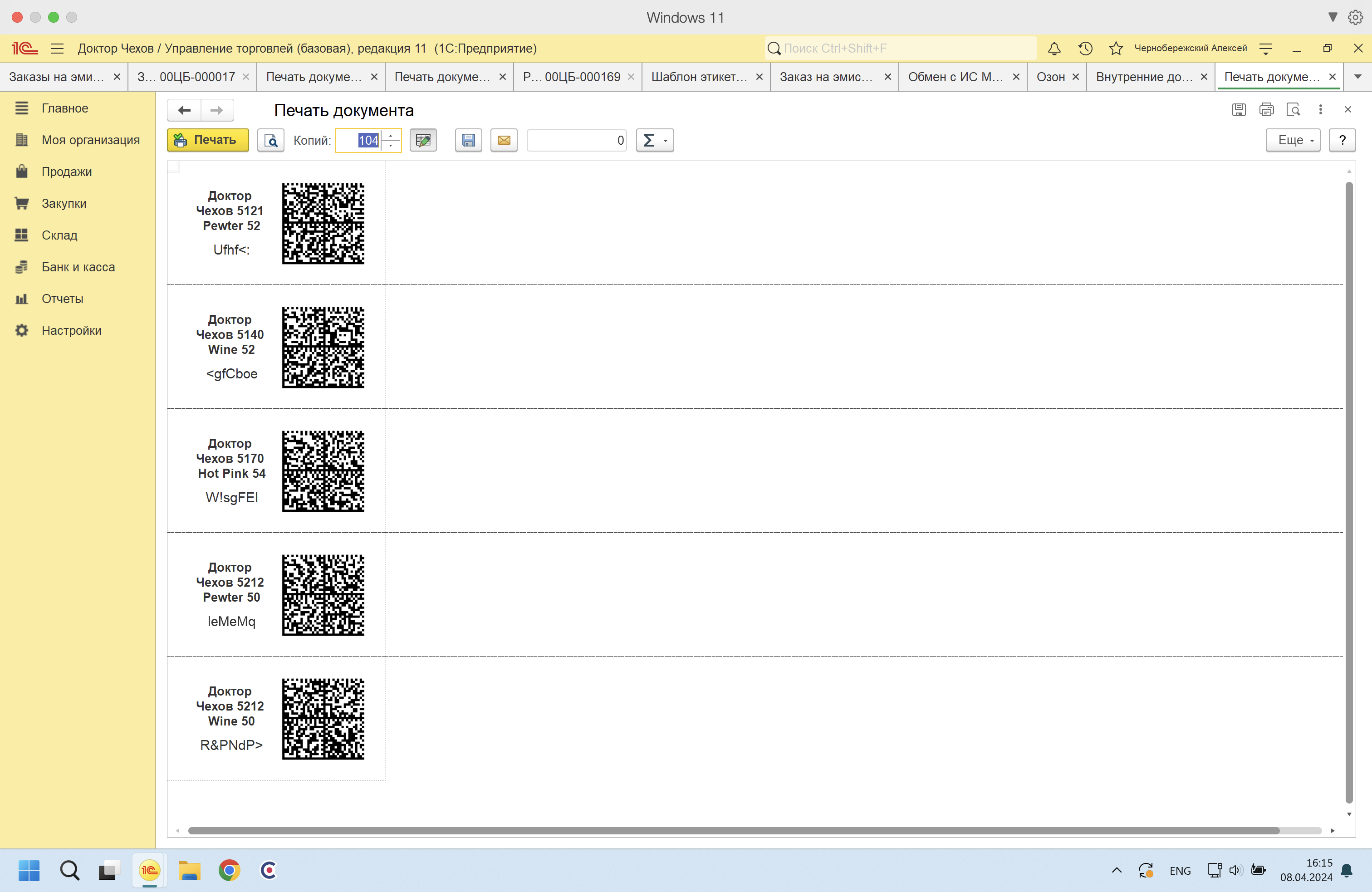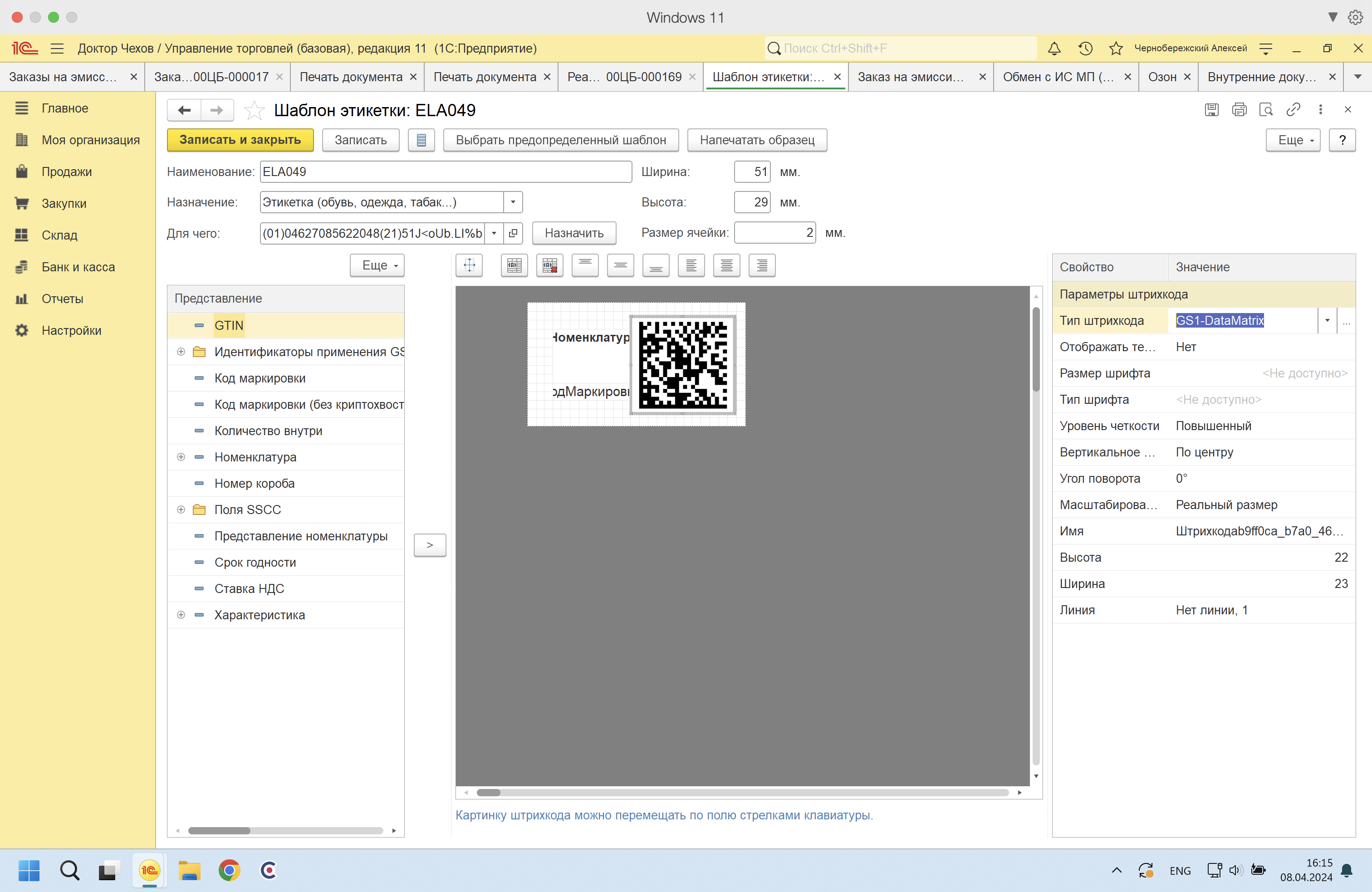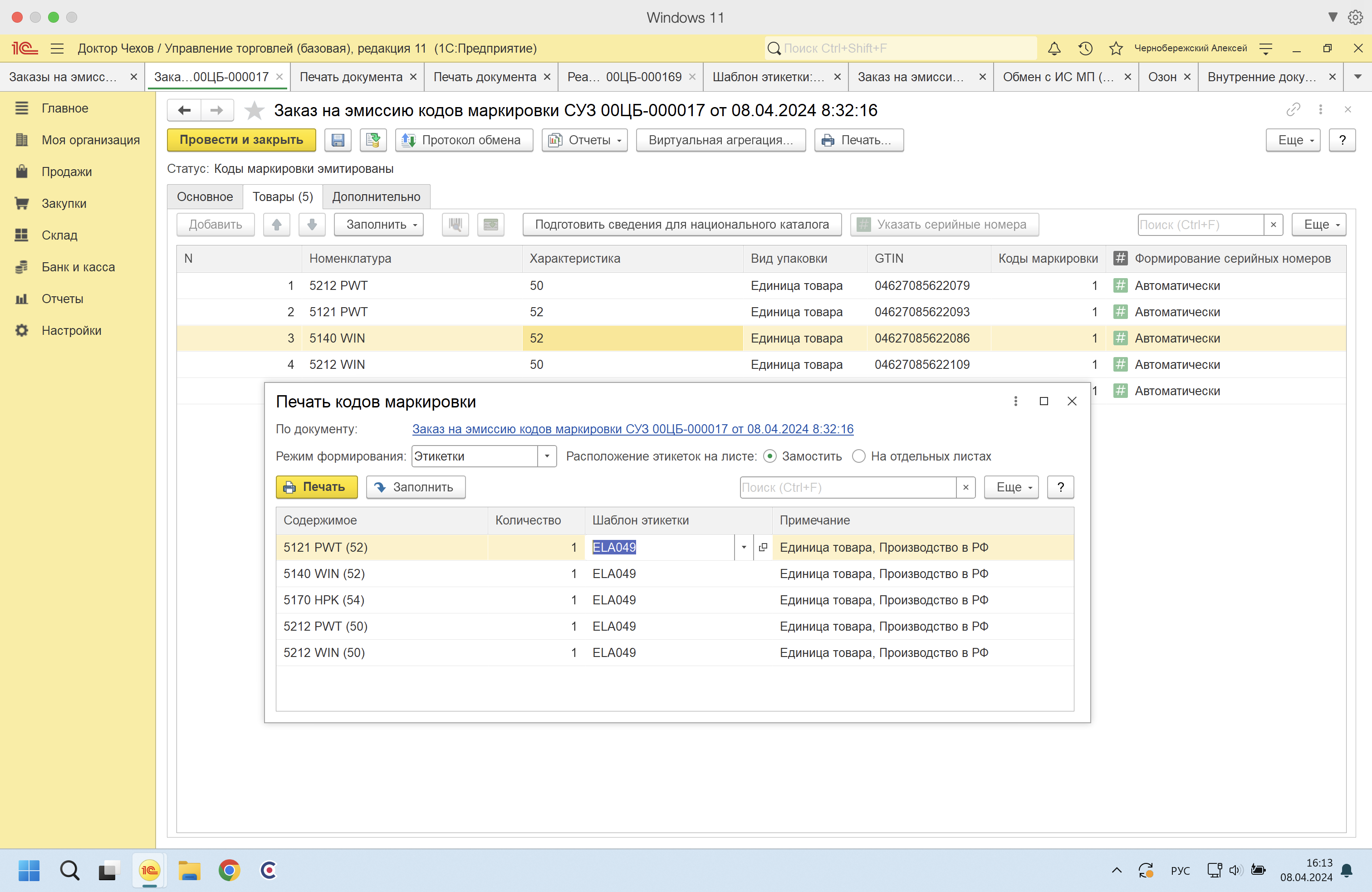 На 1с 8.3.23.2157 УТ 11.5 Базовая настроено получение / печать кодов маркировки честного знака для легкой промышленности через Обмен с ИС МП (одежда, обувь, табак)
