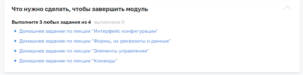 Требуется выполнить 3 задания по курсу Разработчик 1С. На темы: "Интерфейс Конфигурации", "Формы и реквизиты данных" и "элементы управления" или "команды".