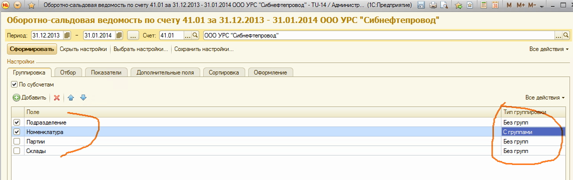 колонки (без выбора типов цен): Группировки/кол-во/цена/сумма (сумма и колво с 41.01. цена расчетная делением)