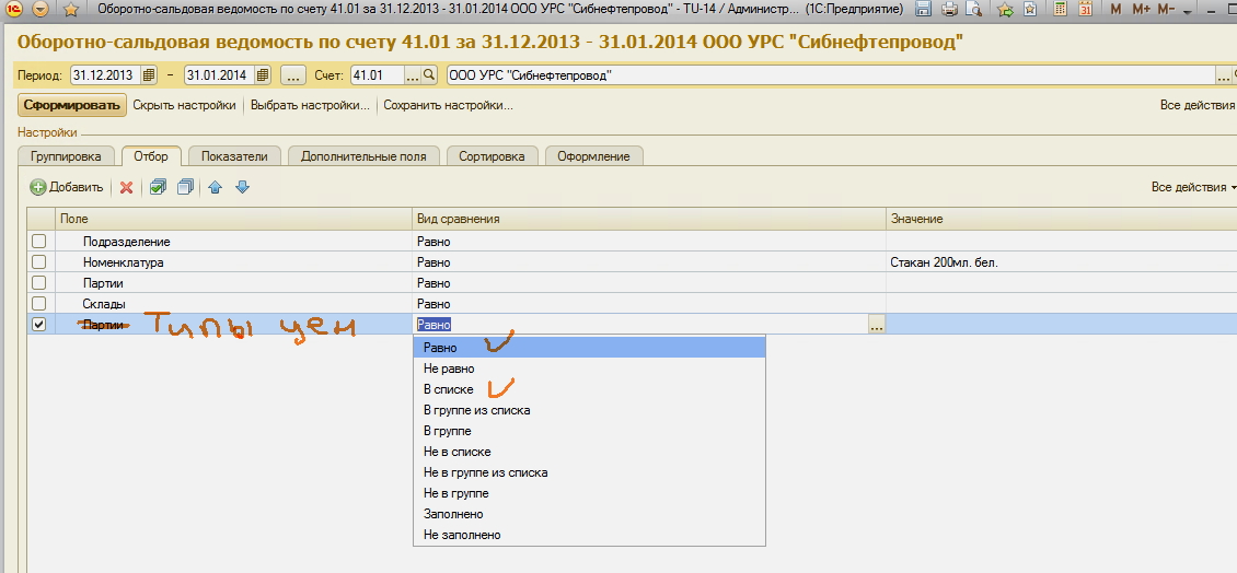 группировки и отборы как во вложенных картинках (типы цены с возможностью "Равно", "В списке")