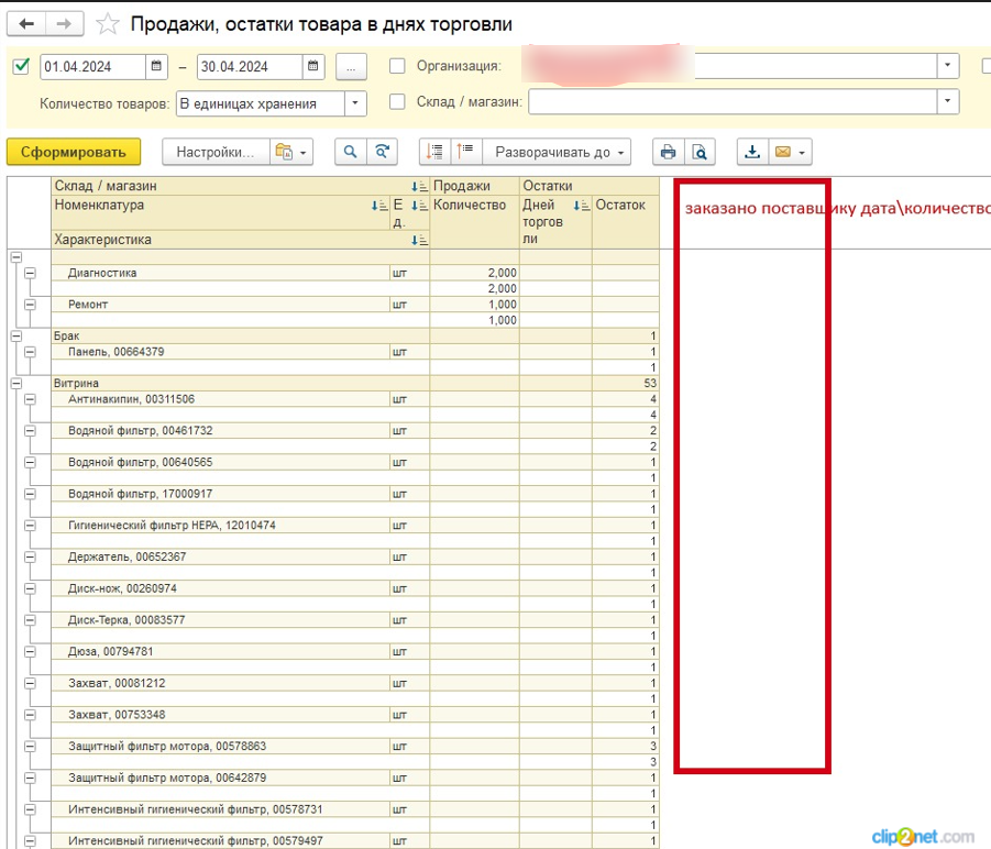 3. в типовой отчет "Продажи, остатки товара в днях торговли" добавить колонку с информацией из регистра накопления "Заказы поставщикам"