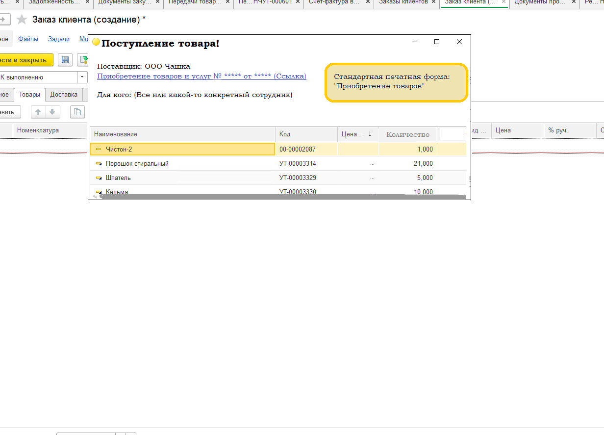 Снабженец создает приобретение товаров и услуг, проводит документ, у всех выскакивает окошко о приобретении товара.