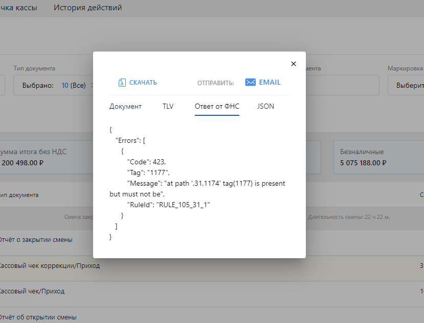 Добрый день. Пробили чек коррекции. Касса АТОЛ 30Ф. Но налоговая не приняла чек коррекции и висит уведомлением: "Присутствуют незадекларированные теги".