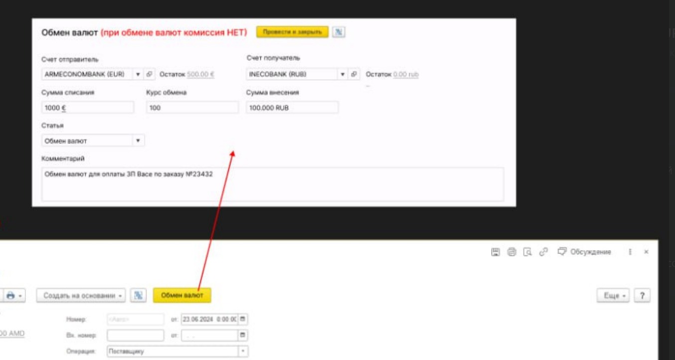 1. Добавить кнопку "Обмен" в расходный со счета, при нажатии открывается форма (скрин1), где указан "счет отправитель" и "счет получатель", задача списать деньги с одного счета, и положить на другой по курсу (если по простому, обычный обмен денег по курсу).