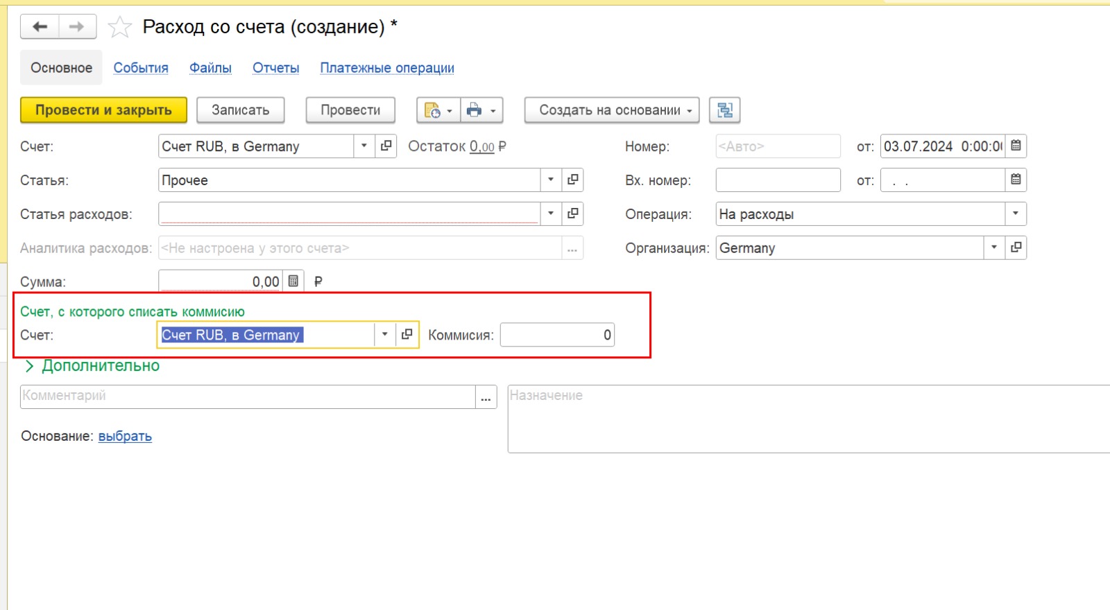 2. Добавить в расходный ордер 2 поля, "комиисия" и "банковский счет" (скрин2). То есть с какого счета списать комиссию, при проводки документа должна списываться сумма комиссии с выбранного счета.