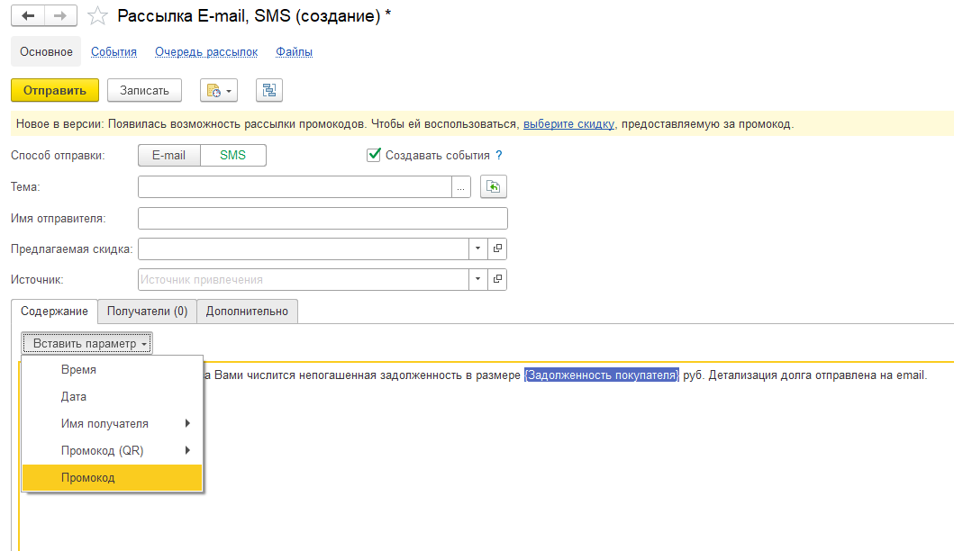 1С:УНФ 3.0, добавить параметр в содержание документа Массовая рассылка