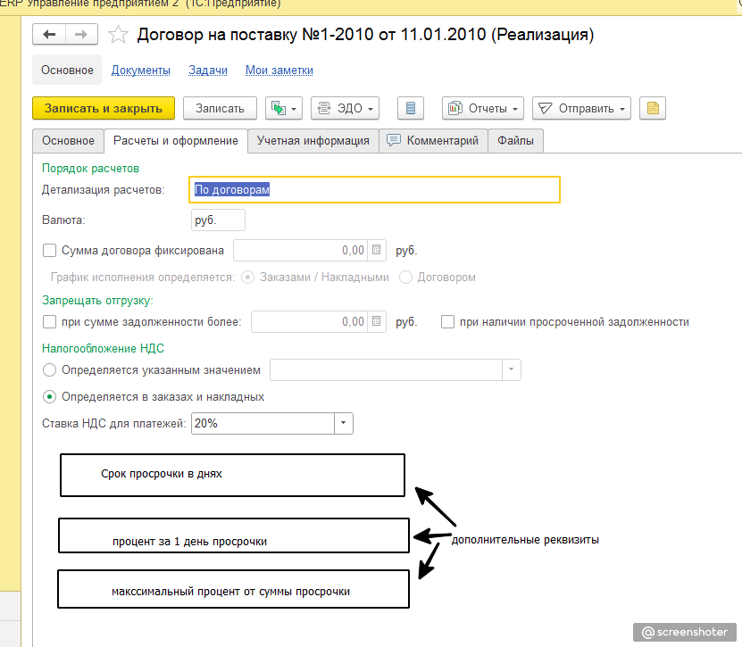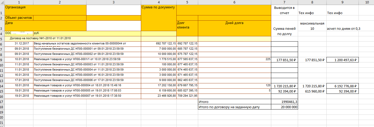 Требуется разработать отчет по расчету пеней по каждой реализации с учетом данных в дополнительных реквизитах в Договореза весь период действия договора (по данным в базе 1С ЕРП),
