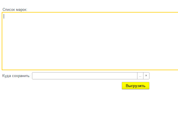 Задача обработки обработать отсканированные коды маркировки, построчно вывести первые 31 символ кода марки в многострочное поле формы. При нажатии кнопки "Выгрузить", создать Excel-файл, в который построчно, в первый столбец записывается значения из многостраничного поля формы, размещенной выше.