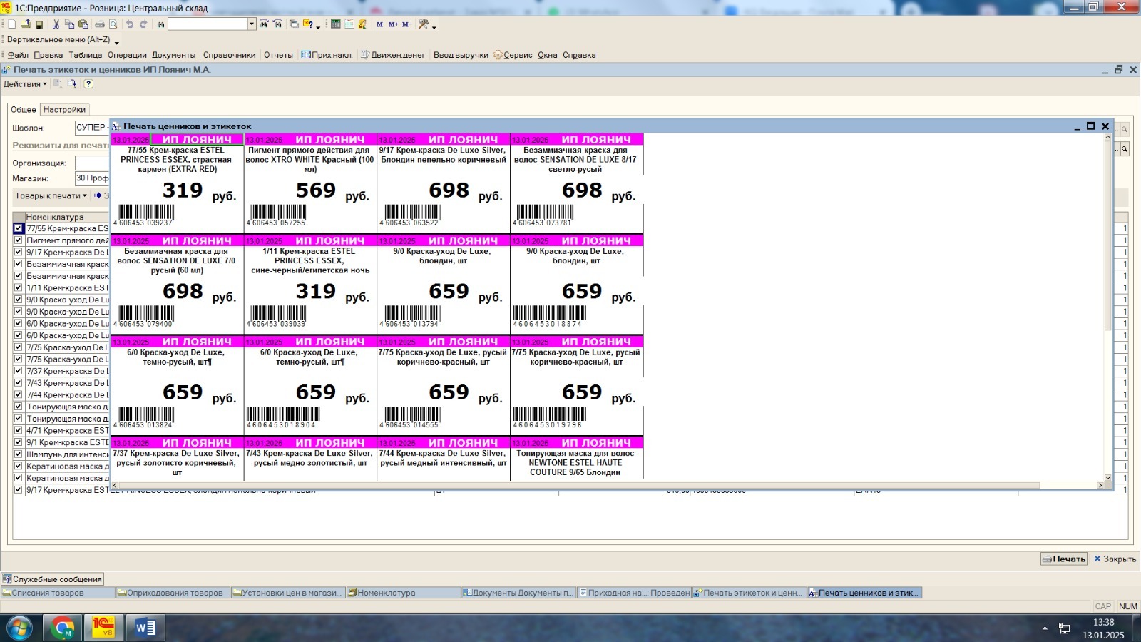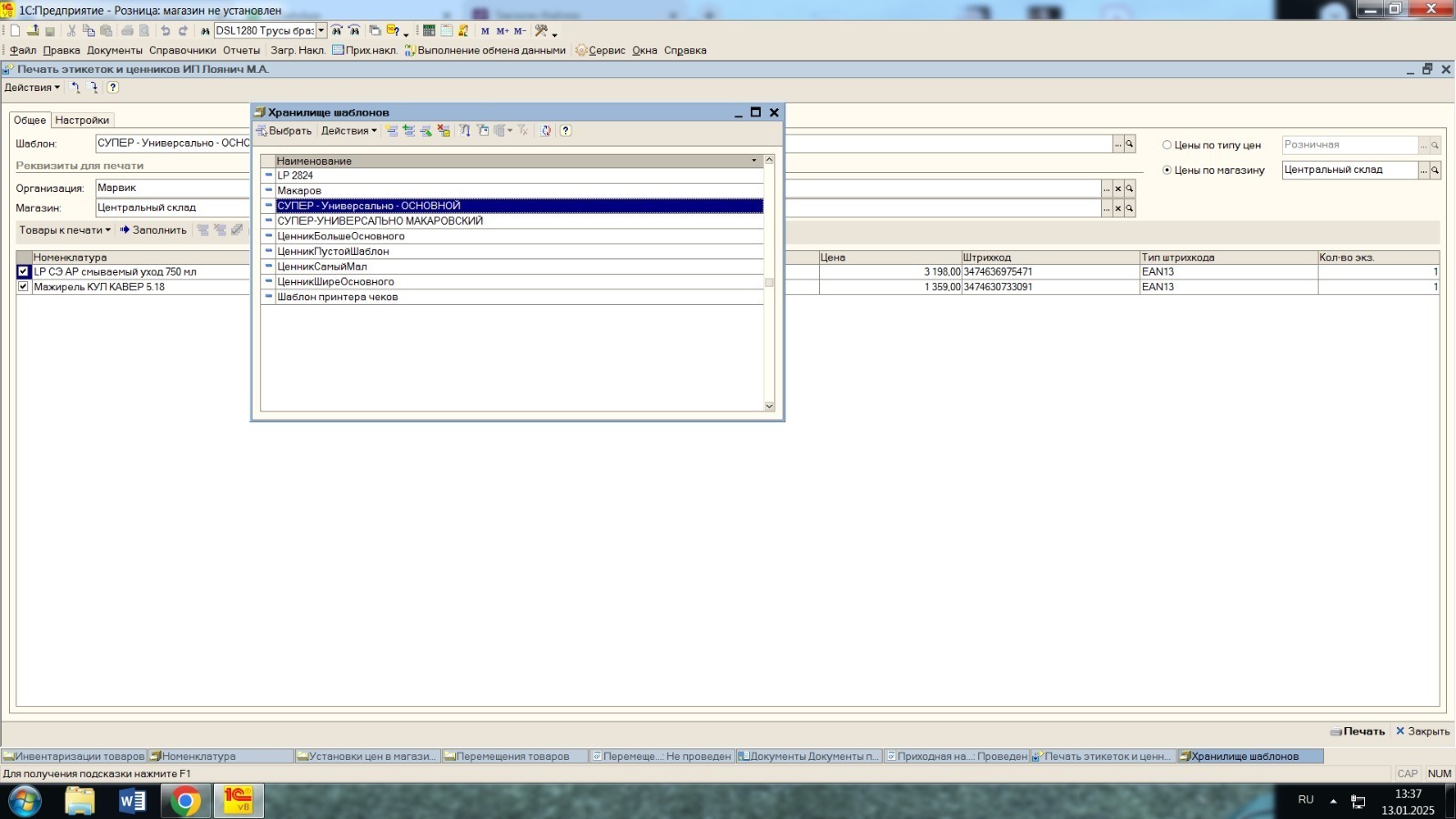 В момент печати ценников, по умолчанию выбирается супер-универсально- основной шаблон.