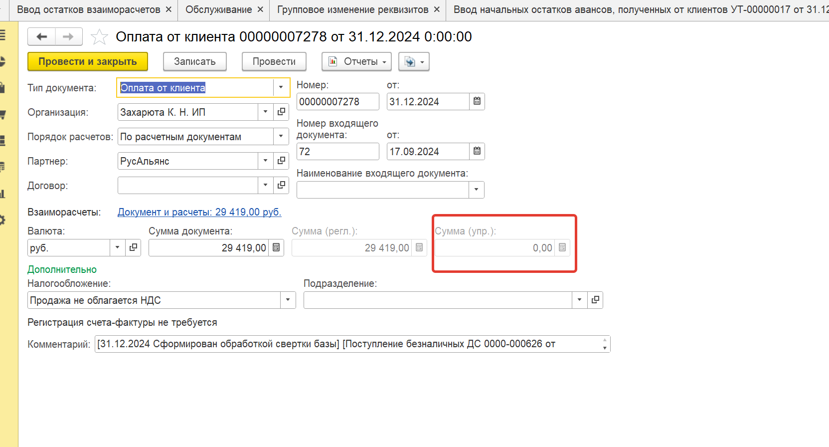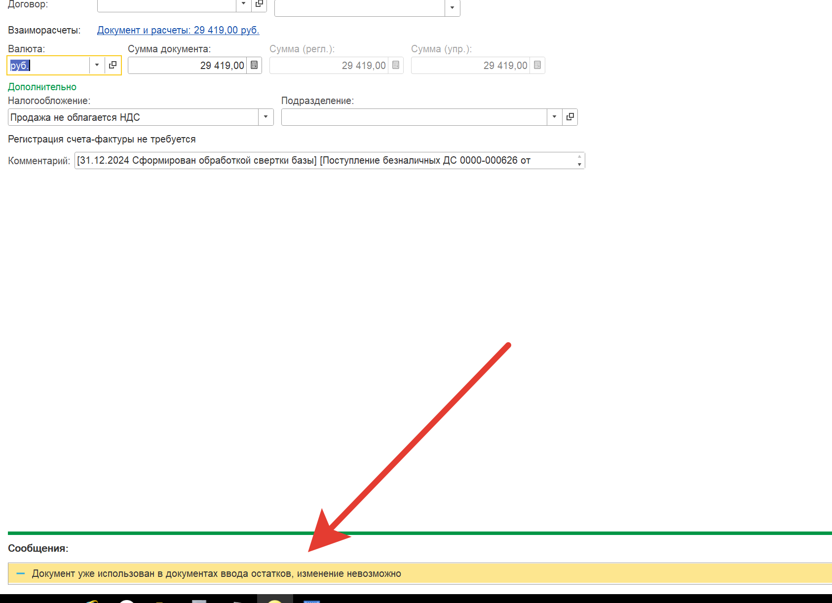 Суть в том что несколько тысяч первичных документов сформированных обработкой "Свертки базы" записалось с ошибкой. А именно не смотря на выбранную валюту "руб" в документе реквизит "Сумма УПР" не заполнена. И заполняется она только если в документе перевыбрать валюту. Тогда сумма заполняется и документ в последствии выгружается. (ЕСЛИ ПРОСТО ЗАПОЛНИТЬ СУММУ ВРУЧНУЮ, ДОКУМЕНТ НЕ ВЫГРУЗИТСЯ). Проблема по сути в том что даже если выбрать валюту и таком образом заполнить реквизит Сумма Упр - то провести или сохранить документ я не смогу так как он ругается что документ явялется частью табличной части документа Ввод нач.остатков. Очищать табличную часть проводить изменять и потом снова заполнять табличную часть может быть провальна так как в процессе возникнет человеческий фактор и может что-то потеряться.