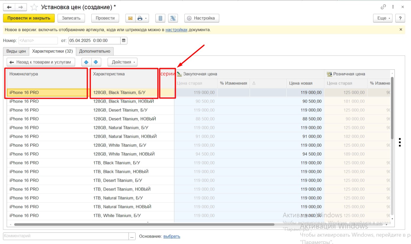 Нужно чтобы в документе установка цен можно было выбирать по мимо НОМЕНКЛАТУРЫ / ХАРАКТЕРИСТИКИ / была возможность выбора СЕРИИ.